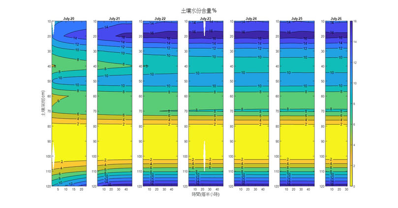 基質層主要作用為入滲地表的雨水及供給植栽水分及養分,在薄層式綠屋頂中,需要快速的排水以及較輕的載重,因此本實驗採用屋頂輕質土,屬砂質土壤,其乾比重0.6、飽和比重1.1皆遠小於一般土壤之比重(約2.65),可以減輕載重以符合建築屋頂的承載上限範圍內,並且其具備快速排水的特性。但是在實驗初期為了使讓植物能在種植期間健康生長,故將其原先樹苗之培養土共同栽種在綠屋頂上,培養土屬黏質土壤,保水能力佳、養分充足,主要供給植物水分及養分。整個綠屋頂實驗土壤之體積量比例培養土(黏土):屋頂輕質土(砂土)為1:1.65。整體厚度設計採10公分,是為了控制載重在屋頂的安全承載範圍內且符合薄層式綠屋頂土壤厚度範圍5~20公分。